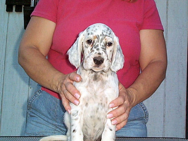 Paige is one of our best! This beautiful tri girl won the English Setter Futurity, Winners Bitch, Best of Winners at the English Setter Association of America National Specialty. She won several specialties and finished going Winners Bitch and Best of Breed at a specialty in Texas. Paige also has several group placements. She was ranked in the top 20 English Setters. Paige was owner/handled for all of her wins. She is a substantial girl with a beautiful head.